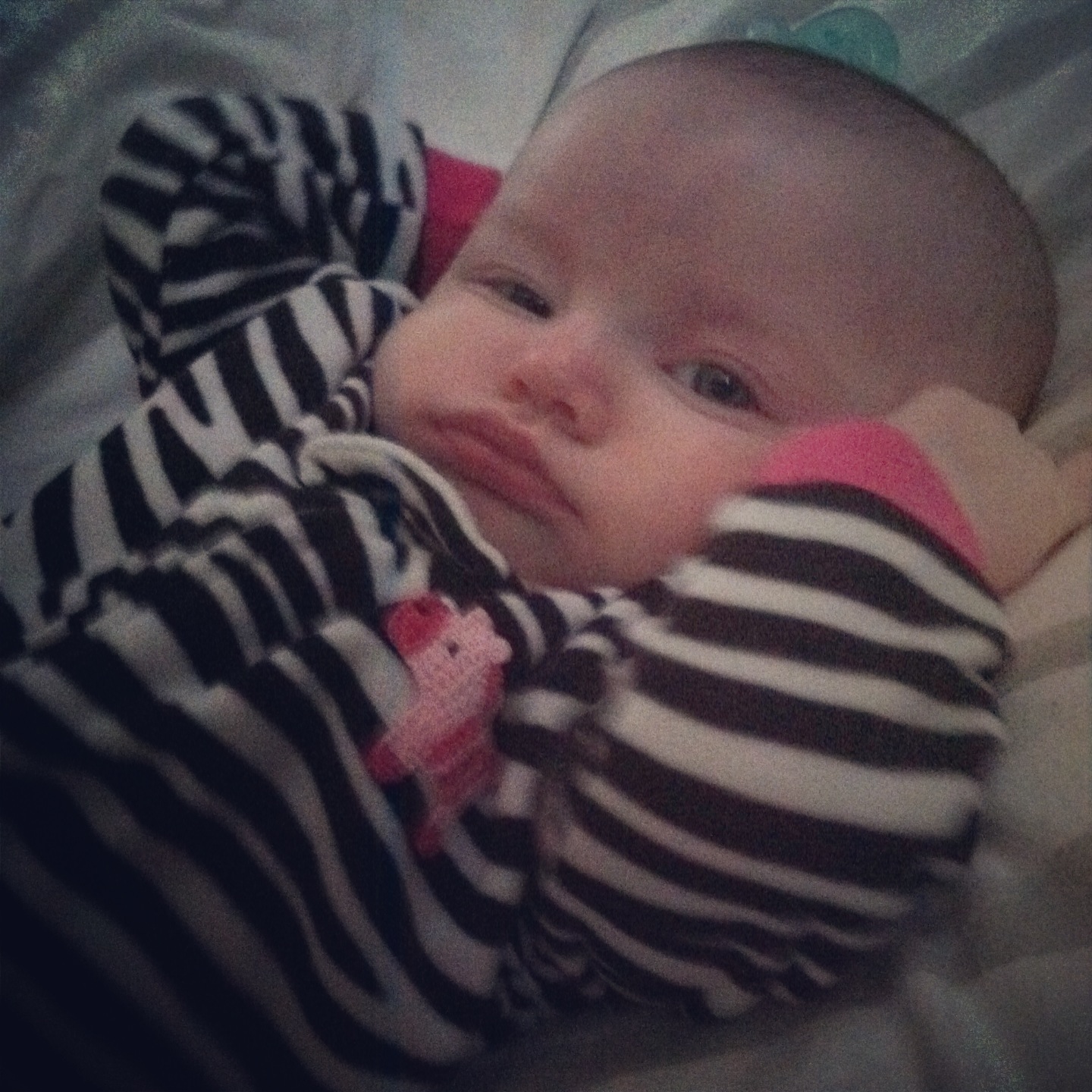 5. Sigh, throw back covers, and hurry into the nursery at the 3 a.m. not sure what is going on cry. Can’t handle her being so far away. Return humidifier, blankies, and baby to their proper station, right next to my side of the bed.