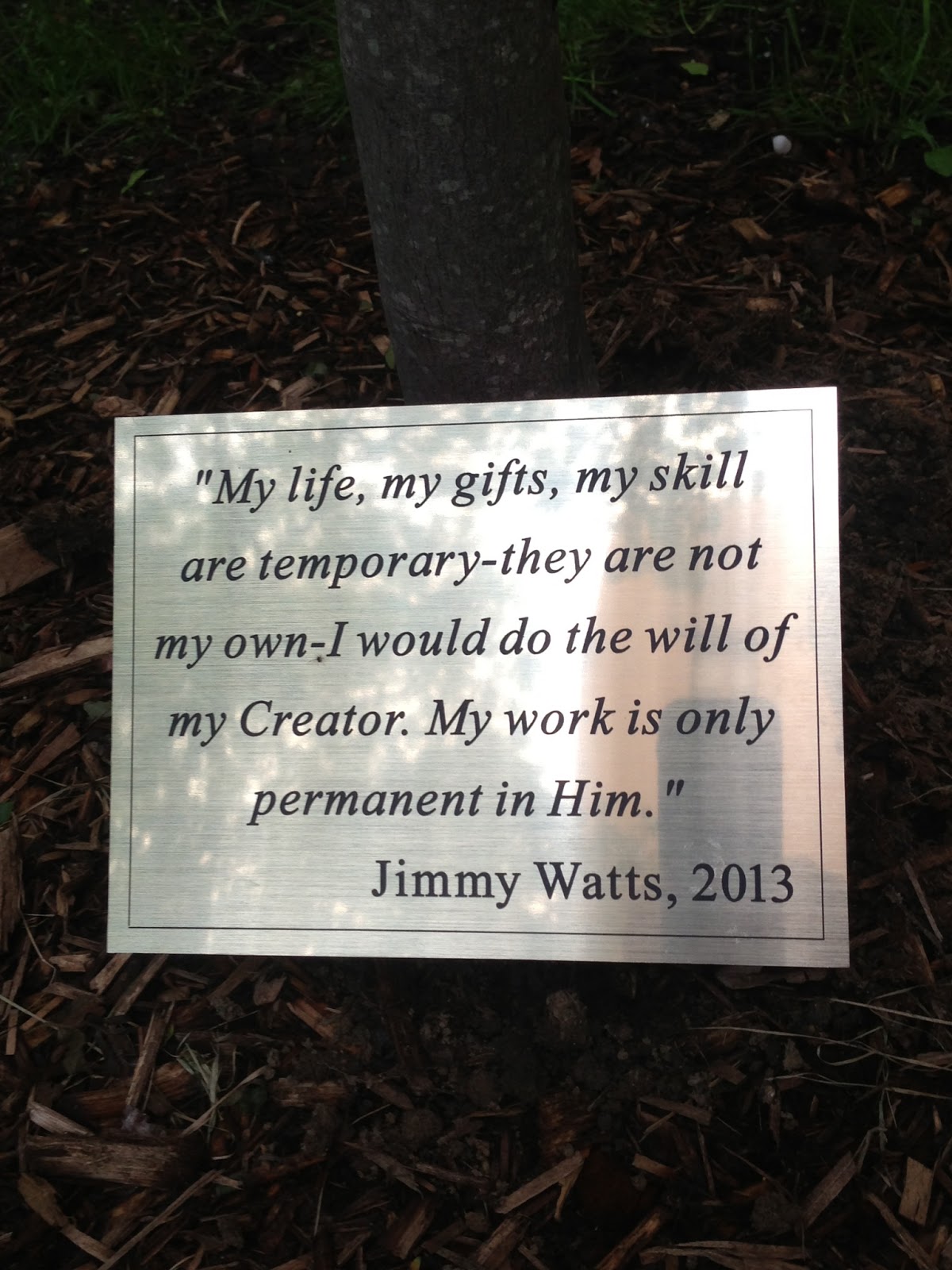 A serviceberry tree grows tall in a grassy square in New York City, a living notice to all who pass that a man came through this world who ascended the muck of life. Beneath that tree lies this plaque with this inscription; a direct quote from your journal; and I just wanted you to know that it has already been proven true.