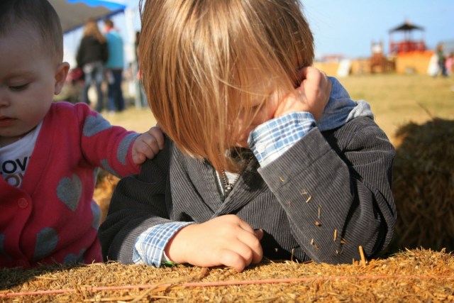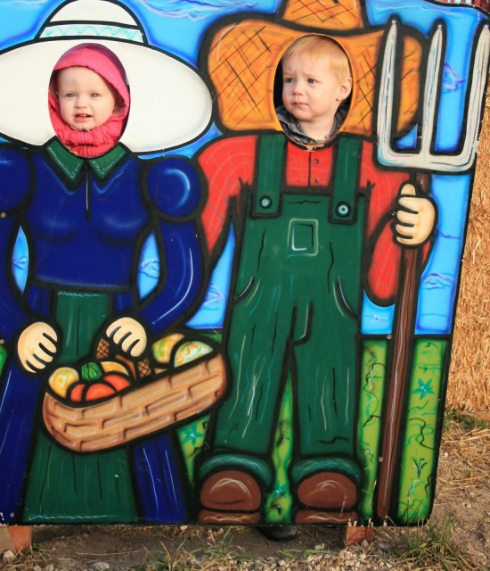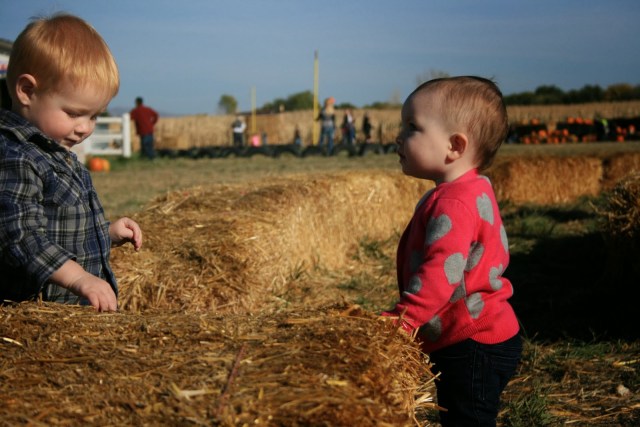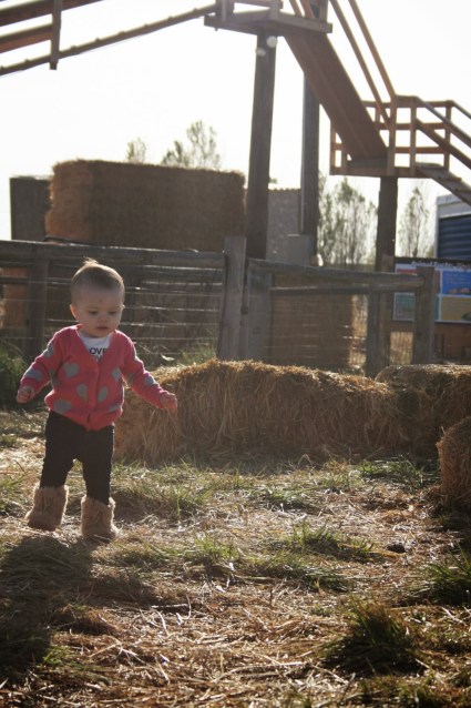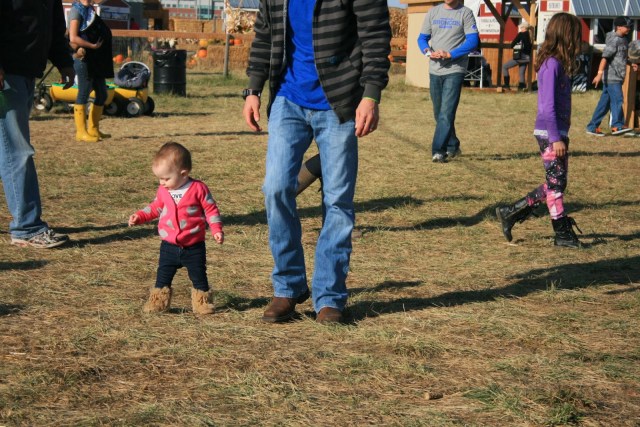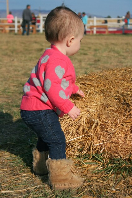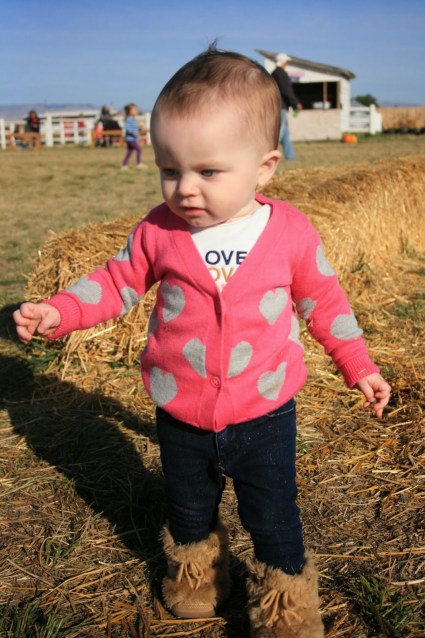 We went to the pumpkin patch with our friends a couple of weeks ago (just like every other family in the world, no?) and it was fun to see Clara wander away from us, running and yelling, wide-eyed and ecstatic to feel free in the great big world. She marched around on that hay like she owned the place, fell on her face more than once (those furry boots are a size too big and hard to walk in, so sue me! That girl’s foot is still a size 2 and I’m tired of waiting to get out of crib shoes) and she thought she was very, very grown up. We could tell. So much so that we opened her a saving’s account that very afternoon in the pumpkin patch, because a local bank was there with a money-wind machine thing that we wanted to try, ha! Any cash you could collect in 30 seconds you got to put into your new account. You’re welcome, Clara. Daddy worked hard for that $10. Now go to college.