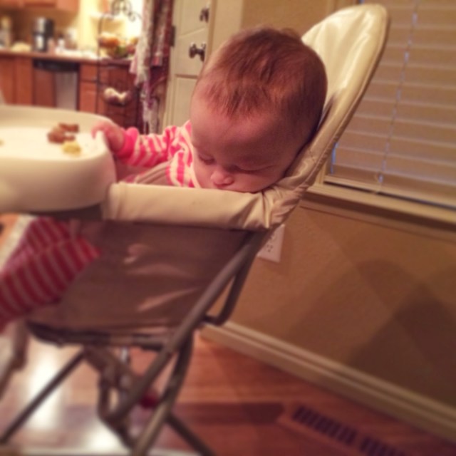 Yesterday Clara woke up around five, but not quite awake, more like crying in a painful nightmare, her eyes glued shut with sleep but big tears still rolling down her cheeks. Her 12-month molars are trying to break through, and when she gets upset in her sleep like that, all she wants is to nurse. I mean, she hasn’t actually nursed for a month, mostly because it hurts while I’m pregnant, and I’m almost positive there’s no milk anyways, but sometimes that’s all she’ll take as comfort. Why oh why this girl never took a binky, I will never understand. But even nursing wasn’t helping yesterday. Nothing was helping. Not a snuggle, not a warm shower, nada. So we made breakfast at 6:45, and around 7:15 I woke up with my face in the scrambled eggs. I picked my head up off the table and saw Clara slumped over, asleep in her high chair. I snapped these pictures before I put her back to bed, where she slept peacefully until 10:30 a.m., allowing me to finish my homework, clean up the house, and even drink some coffee. Small mercies, oh hallelujah π