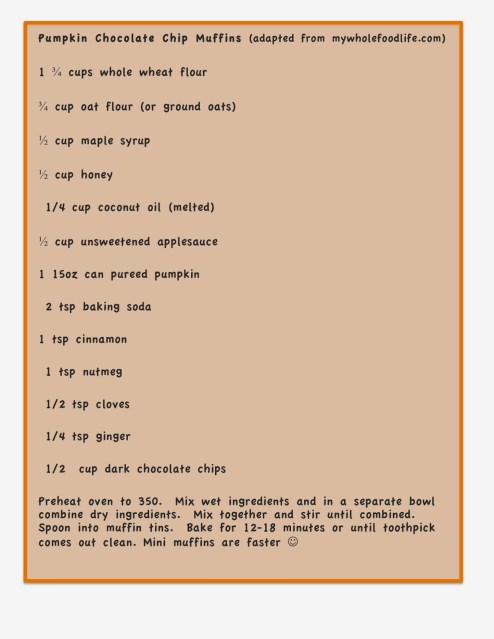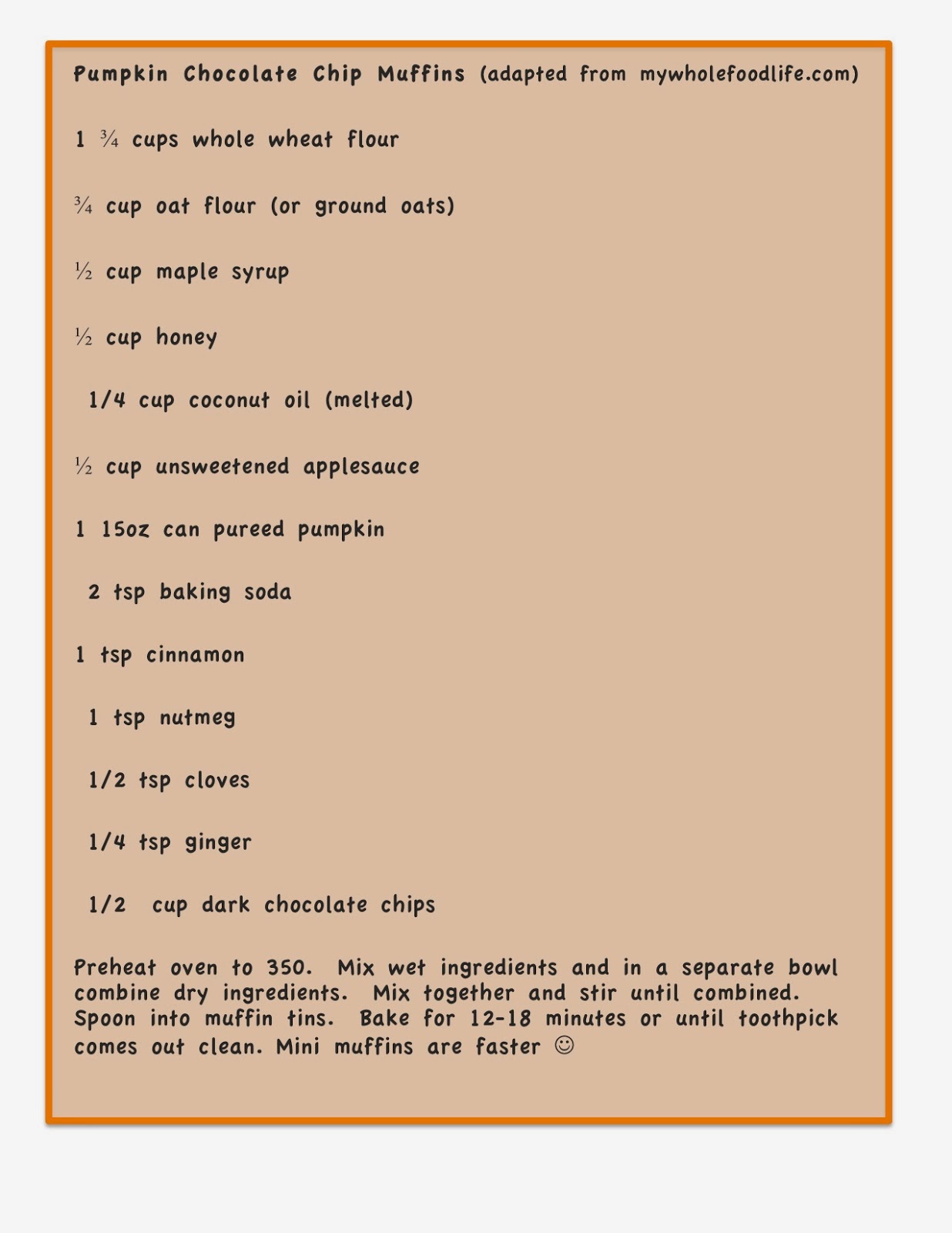 I’ll be hosting my first Thanksgiving this year (we’ll see how that goes), and at the same time trying to stay away from processed sugar (but I love dessert)… So in the spirit of sharing I thought I’d share a recipe with you. These are my favorite naturally sweetened Pumpkin Chocolate Chip Muffins.