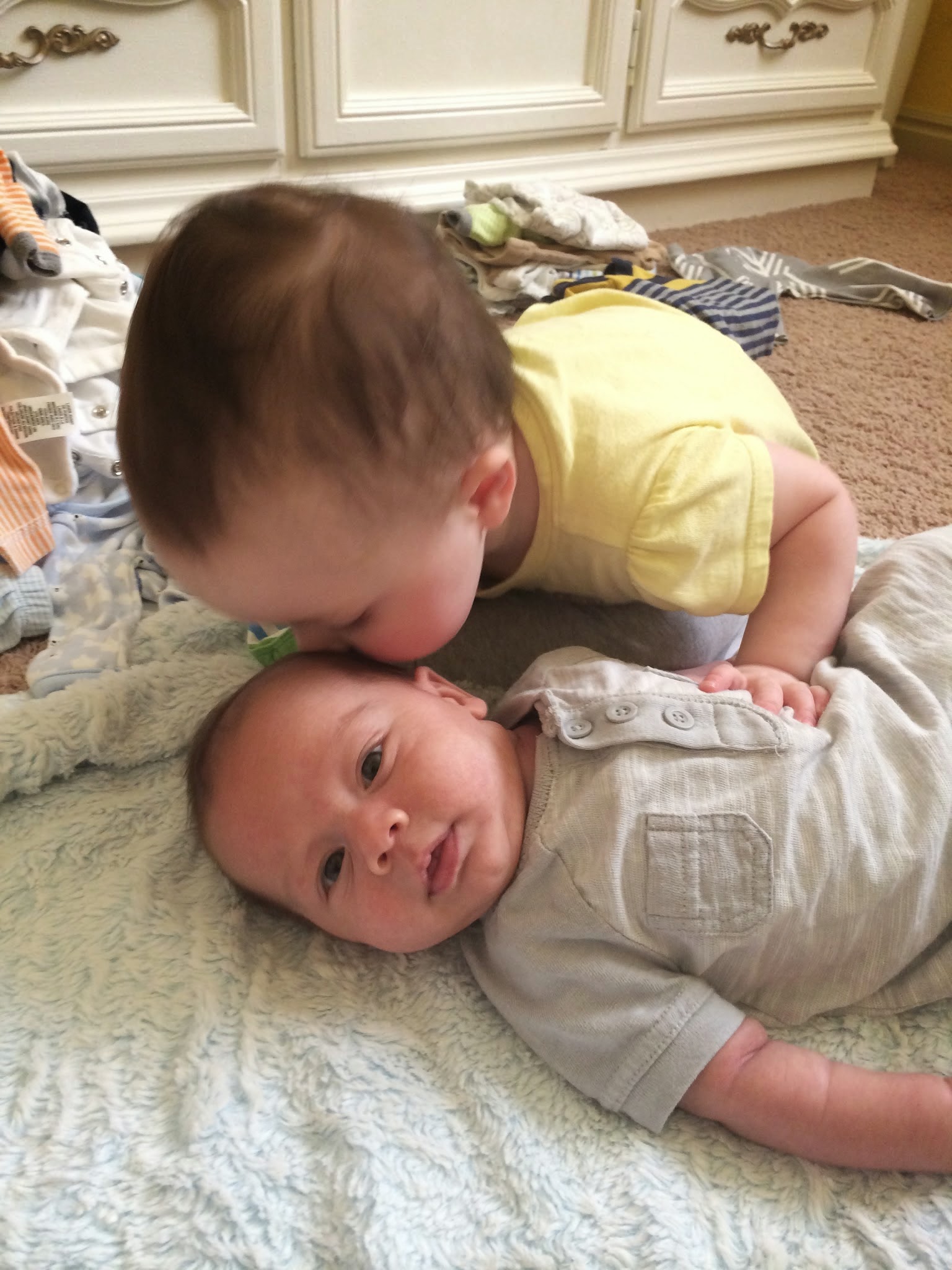 You talk all the live-long day, endless streams of babble along with hand gestures followed by a questioning look, waiting for us to respond to your stories. I play along even though I don’t speak your language, Smoochie, because our lack of understanding does not inhibit your hilarity. Then you’ll toss in the occasional full English sentence like “I see it,” or “help please mama” and it shocks me every single time. Even your baby brother loves to watch you, his eyes following your every move as you flit about the house. Your love for your brother is insatiable, and you always need to know his location. “Brudder?” you ask me, your head tilted in distrust, because you never believe that I know where he is. You kiss him in sets of 5 or 6 and then always go back for a few more right on his mouth, just for good measure. You like to look through his clothes and make big messes tossing them out of his dresser drawers, which drives me crazy. But you also love to help do chores, so putting them back is no big deal to you. The vacuum and the broom bring you great joy, as does unloading the dishwasher with me. I stand you on the counter and hand you plates and bowls, which you set in their cupboards with smug satisfaction. You are not afraid to be smug.